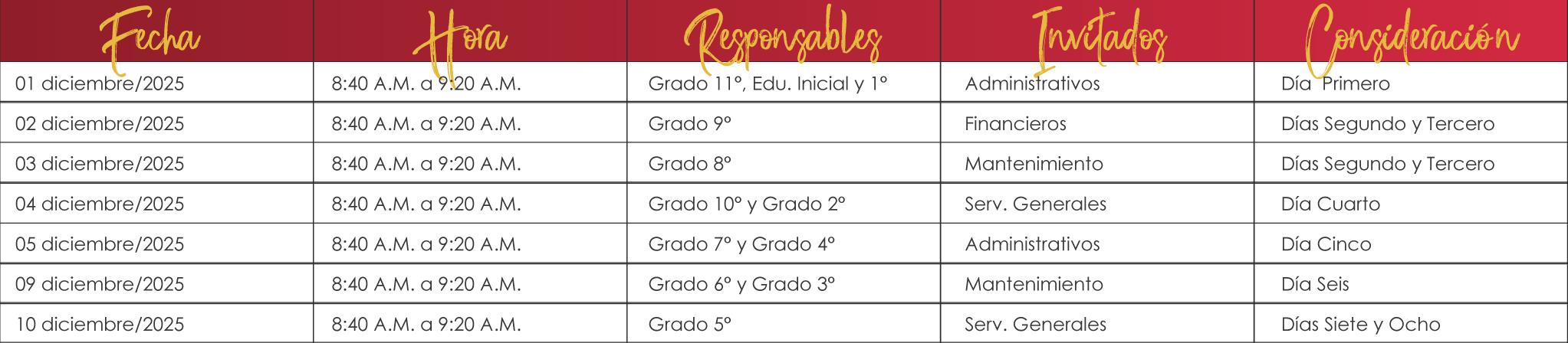 • Jueves, 11 de diciembre de 2025:    Nivel de Educación inicial y Primaria.