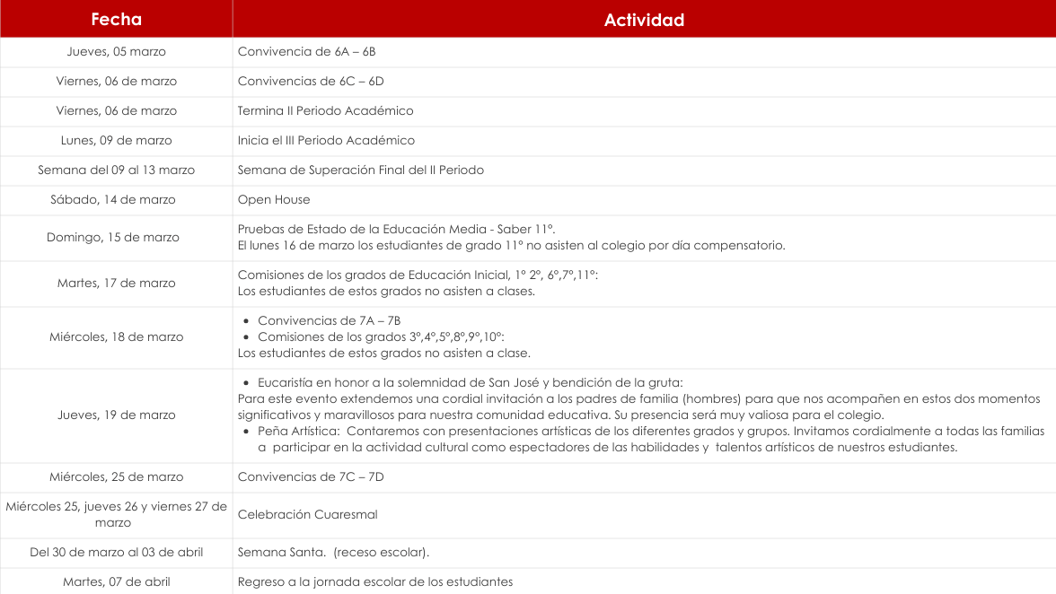 En esta oportunidad, compartimos con ustedes las fechas importantes del mes, en procura de que puedan organizar con anticipación sus actividades y compromisos y acompañar el proceso de sus hijos. Agradecemos su disposición y puntual participación en cada uno de los siguientes espacios programados: